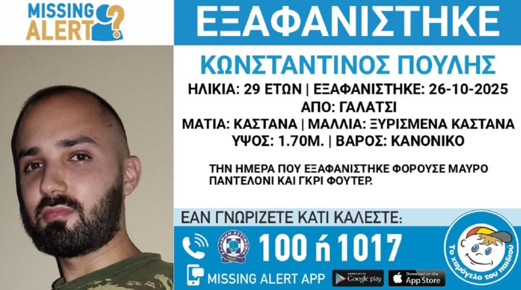 Συναγερμός έχει σημάνει στο Γαλάτσι μετά την εξαφάνιση του 29χρονου Κωνσταντίνου Πούλη την Κυριακή 26 Οκτωβρίου, σύμφωνα με το «Χαμόγελο του Παιδιού».