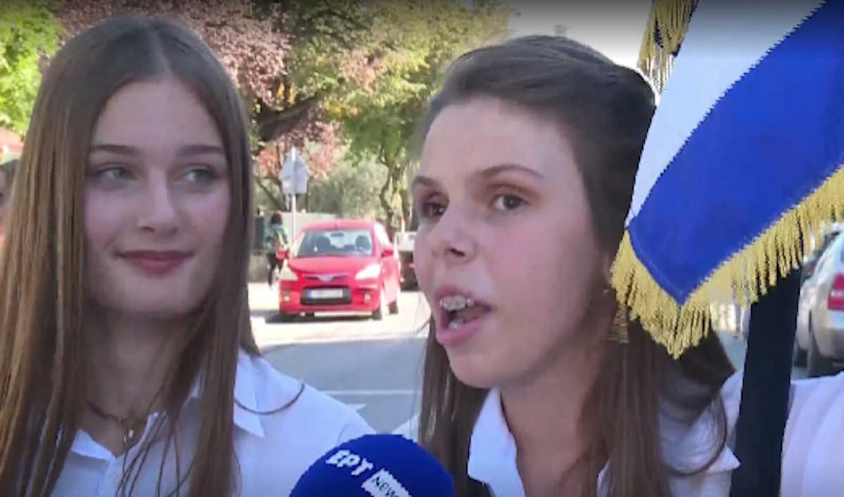 Η νεαρή μαθήτρια είναι από την Αλβανία, όμως, όπως δηλώνει στην κάμερα της ΕΡΤ, νιώθει ευγνωμοσύνη που κατάφερε να σηκώσει τη γαλανόλευκη.