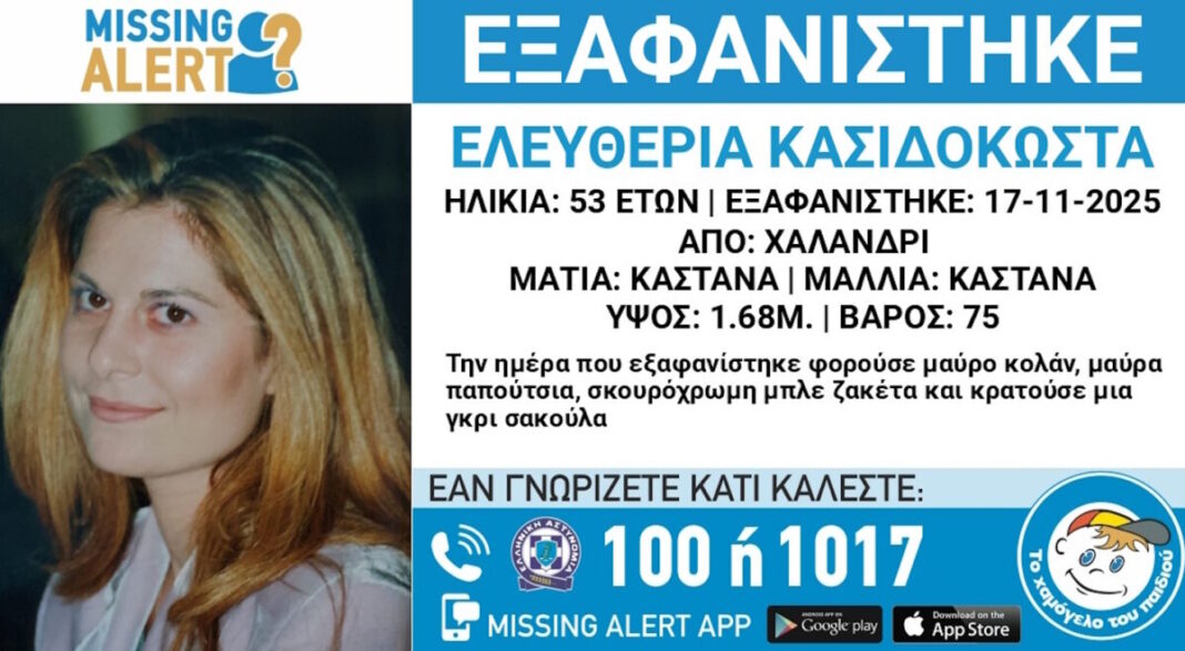 Συναγερμός έχει σημάνει στο «Χαμόγελο του Παιδιού» για την εξαφάνιση της 53χρονης Ελευθερίας Κασιδόκωστα από το Χαλάνδρι, με την οργάνωση να δημοσιοποιεί τα στοιχεία της κατόπιν αιτήματος της οικογένειάς της, καθώς υπάρχουν ανησυχίες για την ασφάλειά της.