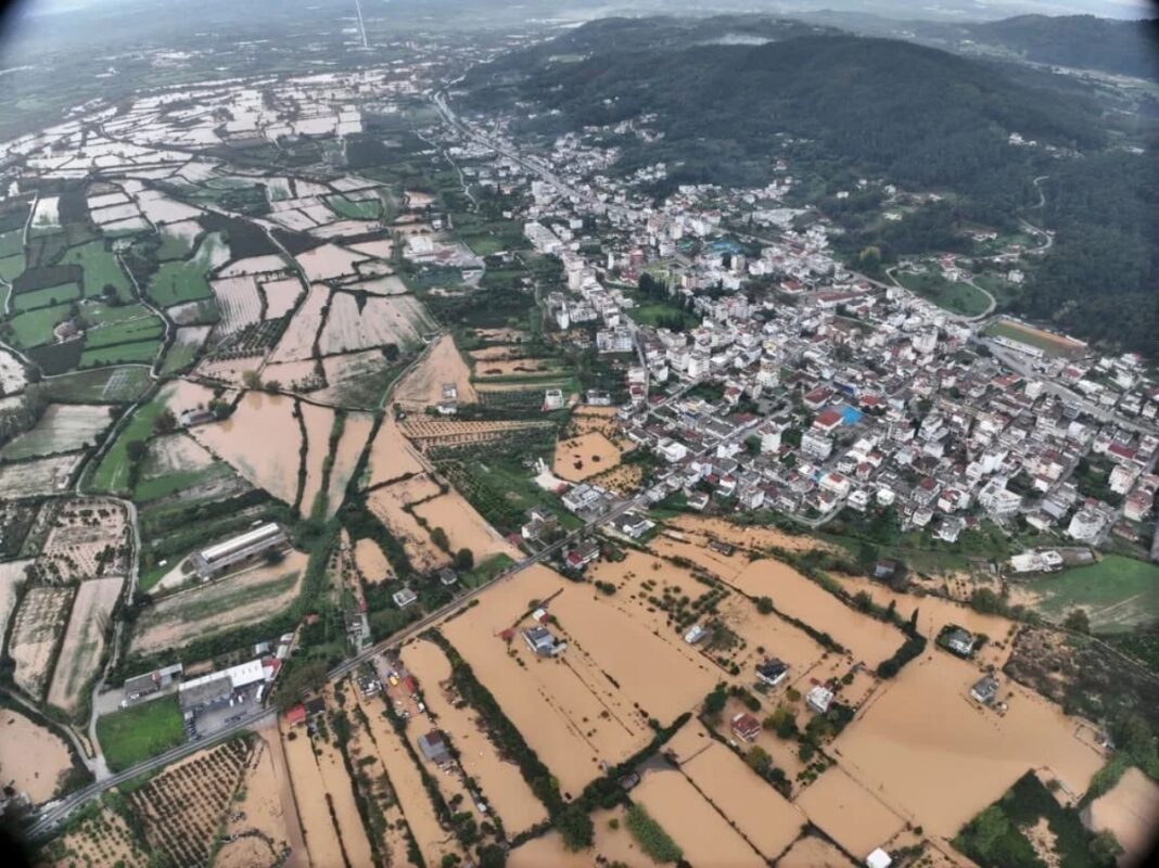 Εικόνες από ψηλά, δείχνουν το μέγεθος της καταστροφής, με τεράστιες εκτάσεις να έχουν μετατραπεί σε μία λίμνη λάσπης προκαλλώντας μεγάλη καταστροφή στις εκτάσεις της περιοχής.