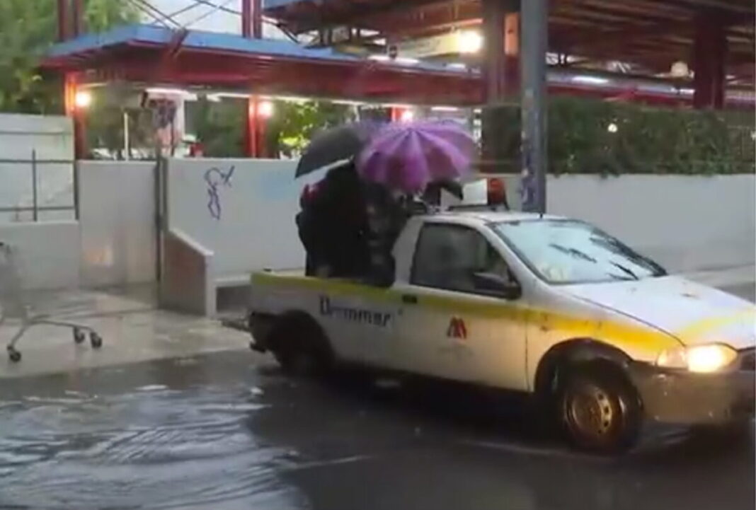 Ο δρόμος έξω από τον σταθμό του ηλεκτρικού στο Μοσχάτο μετατράπησε σε λίμνη και επιστρατεύτηκε ένα φορτηγάκι του δήμου για να μεταφερθούν με ασφάλεια οι πολίτες.