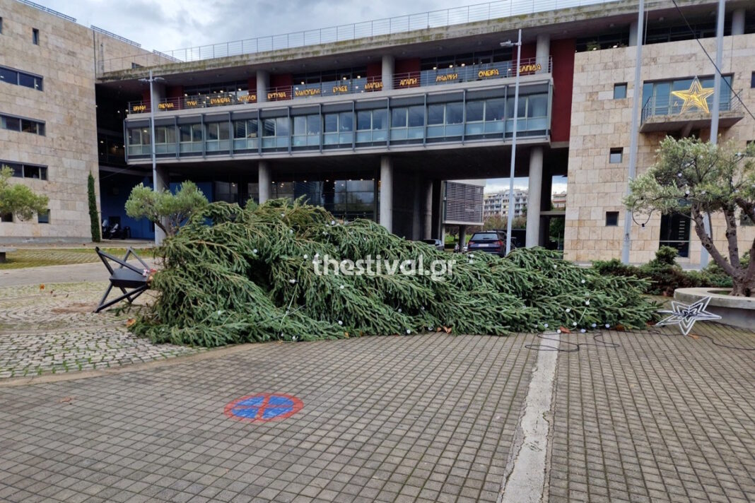 Θεσσαλονίκη: «Κατέρρευσε» το χριστουγεννιάτικο δέντρο μπροστά στο δημαρχείο εξαιτίας των ισχυρών ανέμων της κακοκαιρίας Byron