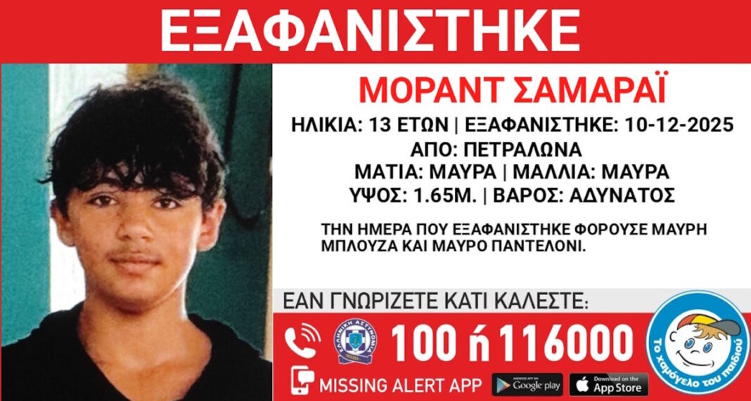 Ο 13χρονος εξαφανίστηκε το απόγευμα της 10 Δεκεμβρίου 2025 εξαφανίστηκε από χώρο φιλοξενίας και το «Χαμόγελο του Παιδιού» ενημερώθηκε για την εξαφάνιση σήμερα 11/12/25 και άμεσα προχώρησε στην δημοσιοποίηση των στοιχείων του, καθώς ενδεχομένως να συντρέχουν λόγοι που θέτουν την ζωή του σε κίνδυνο.