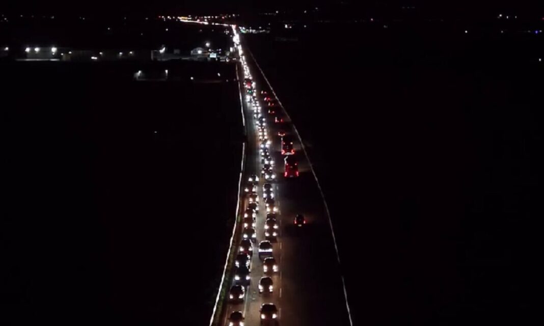 Η κάμερα του drone του Orange Press Agency καταγράφει εντυπωσιακές όσο και αποκαρδιωτικές εικόνες, με την ουρά των αυτοκινήτων να σχηματίζει ένα ατελείωτο «ποτάμι» από φώτα μέσα στη νύχτα καθώς τα μπλόκα των αγροτών στην Εθνική Οδό έχουν κάνει δύσκολη τη μετακίνηση.