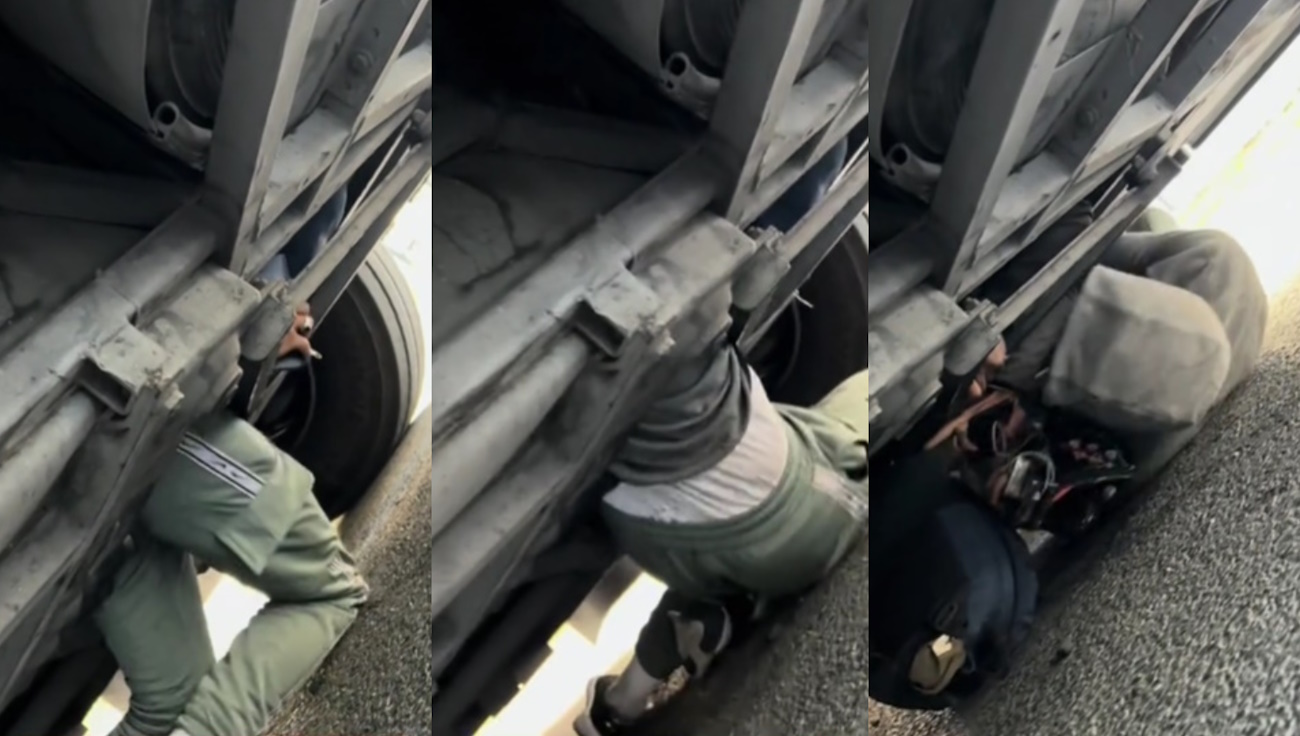 Ο οδηγός έκπληκτος καταγράφει, αρχικά, την προσπάθεια ενός μετανάστη να βγει κάτω από το πούλμαν. Ο άνδρας είχε κρυφτεί σε χώρο που δεν υπάρχει πρόσβαση, πάρα μόνο κάτω από το λεωφορείο.