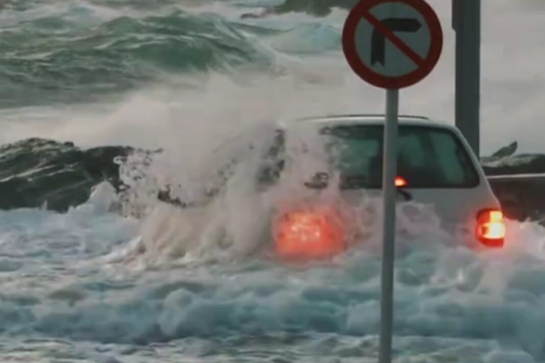 Μέσα στο χαός, οδηγός αποφάσισε να ρισκάρει για να σώσει το αυτοκίνητό του. Εκείνος καταγράφηκε σε βίντεο που τον δείχνει να παλεύει κυριολεκτικά με τα κύματα για να απομακρύνει το αυτοκίνητό του.