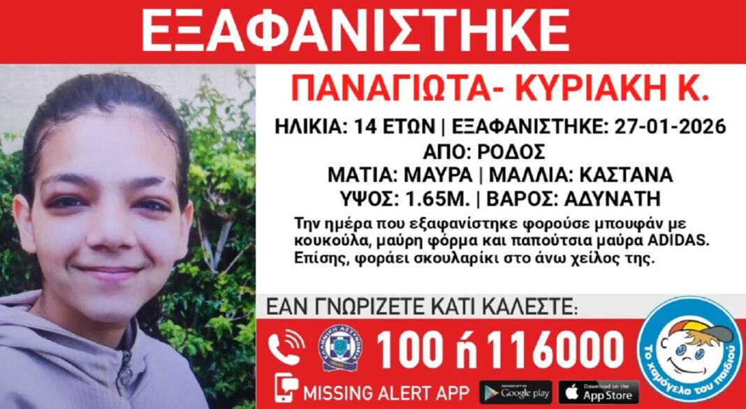 Η 14χρονη Παναγιώτα-Κυριακή εξαφανίστηκε από χώρο παιδικής προστασίας στη Ρόδο το πρωί της Τρίτης, με τις αρχές και πολίτες σε επιφυλακή για την ασφάλειά της.
