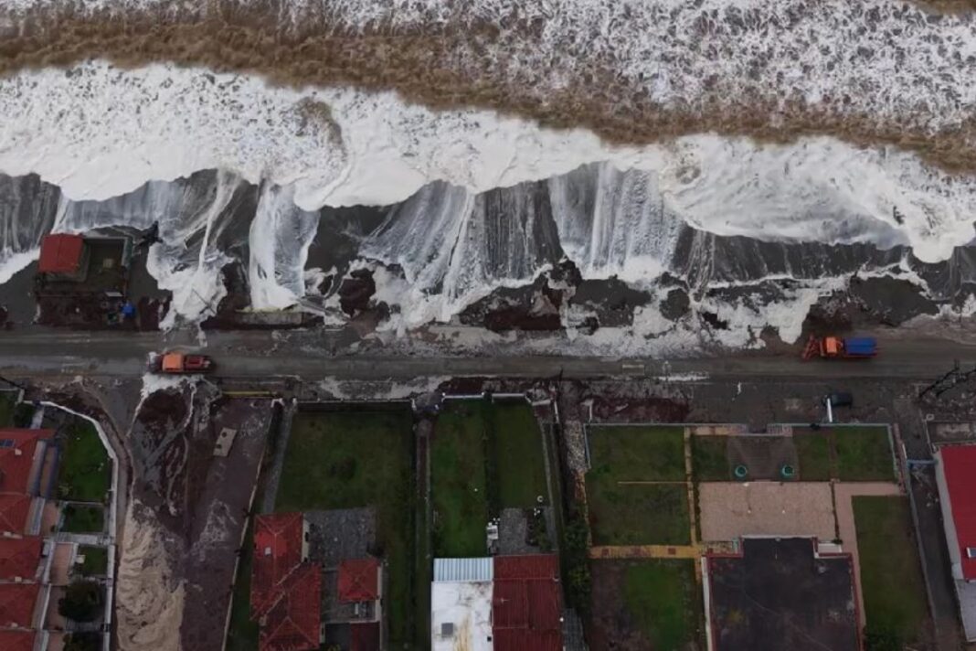 Στα εναέρια πλάνα φαίνεται καθαρά ότι ο δρόμος και η θάλασσα έχουν σχεδόν ενωθεί. Τα δυνατά κύματα, μαζί με τους πολύ ισχυρούς ανέμους, έχουν περάσει την ακτή και έχουν καλύψει τον δρόμο, που μοιάζει πλέον σαν μέρος της θάλασσας.
