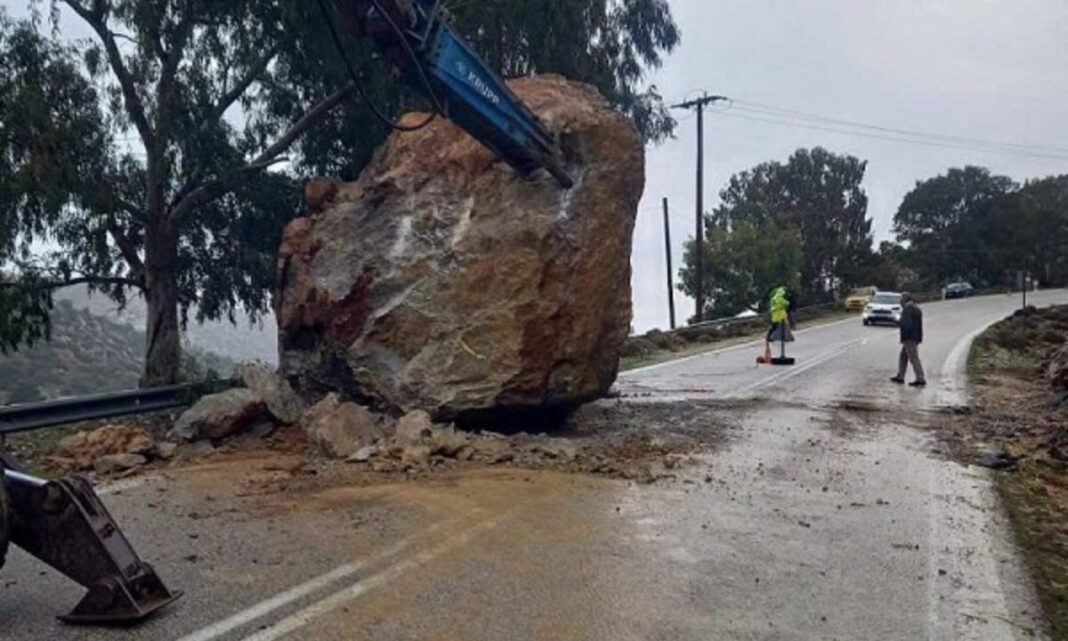 Αποκλεισμένη παραμένει και σήμερα (02.02.2026) η εθνική Χίου Καρδαμύλων, από την επικίνδυνη κατολίσθηση που σημειώθηκε την Κυριακή όταν τεράστιος βράχος προσγειώθηκε στον δρόμο, μία ανάσα μακριά από τα αυτοκίνητα που περνούσαν από το σημείο.