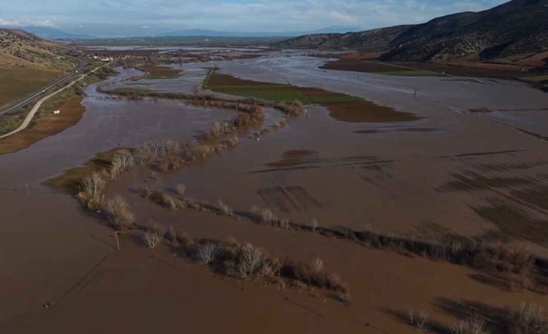 Ο Πηνειός προκάλεσε εκτεταμένες πλημμύρες στην περιοχή ανάμεσα στη Λάρισα και τα Τρίκαλα, θέτοντας σε κίνδυνο τοπικές καλλιέργειες και περιουσίες.