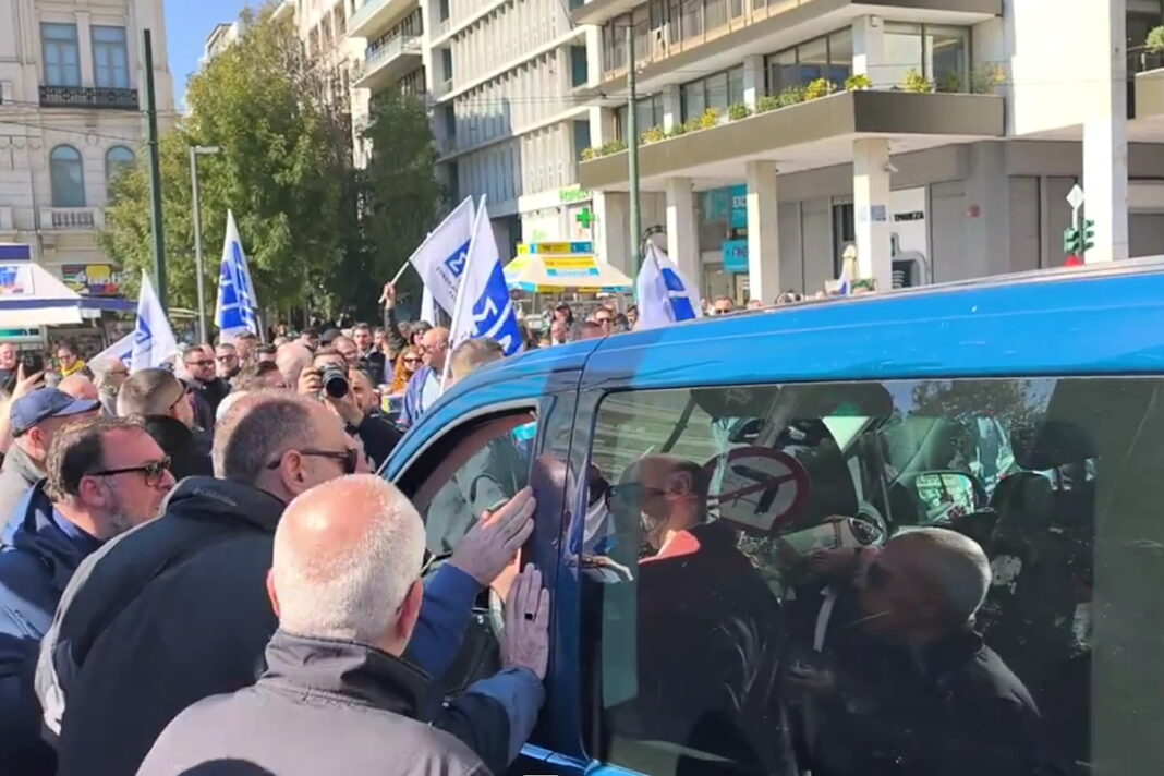 «Μας κλέβετε τη δουλειά» φώναζαν οι οδηγοί ταξί – διαδηλωτές χωρίς να επιτρέπουν στο όχημα να προχωρήσει και να περάσει από το σημείο όπου έχει κλιμακωθεί η απεργία.