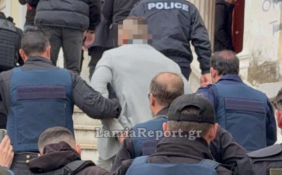 Σκυφτός και κάτω από δρακόντεια μέτρα ασφαλείας, οδηγήθηκε στο εσωτερικό του κτιρίου προκειμένου να οδηγηθεί στο γραφείο του Ανακριτή.