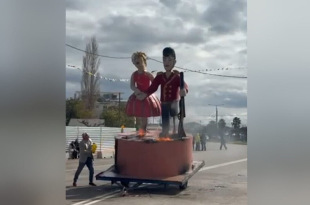 Λύση βρέθηκε έστω και μετά από πάνω μια ώρα παιδέματος! «Έλουσαν» γύρω γύρω τον βασιλιά καρνάβαλο με μπόλικο εύφλεκτο υλικό και τελικά πήρε φωτιά.