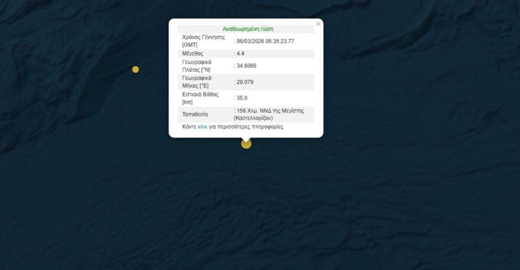 Σεισμός 4,4 Ρίχτερ σημειώθηκε στις 07:35 το πρωί της Παρασκευής (6.3.26) νότια του Καστελλόριζου.