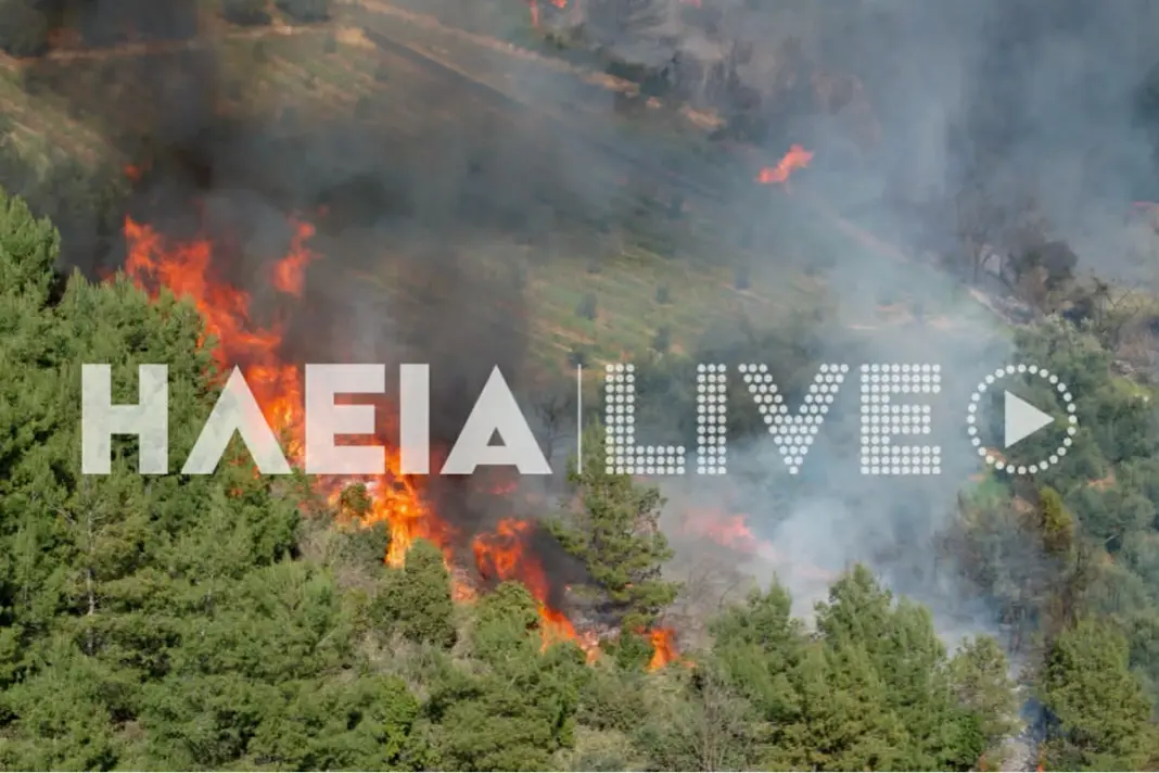 Η φωτιά εκδηλώθηκε σε δύο μέτωπα στον Ελαιώνα στην Ηλεία, με τις επιχειρήσεις κατάσβεσης να είναι ιδιαίτερα δ’υσκολες λόγω των ισχυρών ανέμων που πνέουν στην περιοχή.