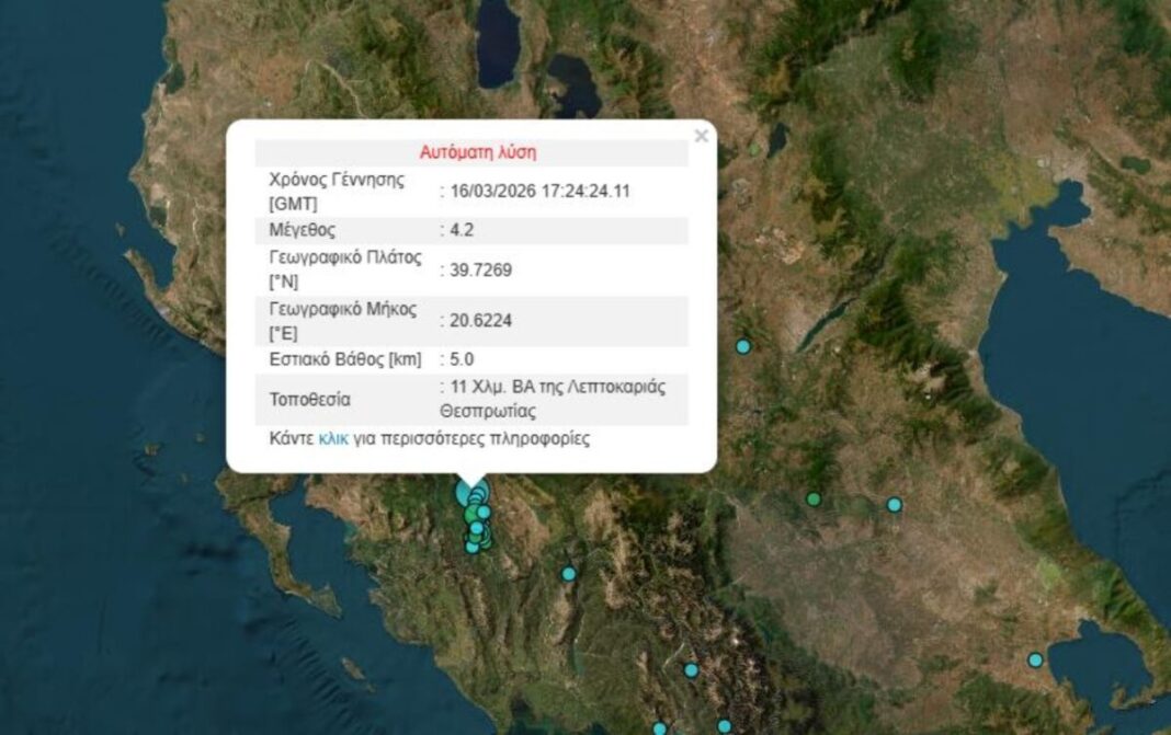 Σεισμός ταρακούνησε την Θεσπρωτία το βράδυ της Δευτέρας 16.03.2026, με μέγεθος 4,2 βαθμούς της κλίμακας Ρίχτερ.