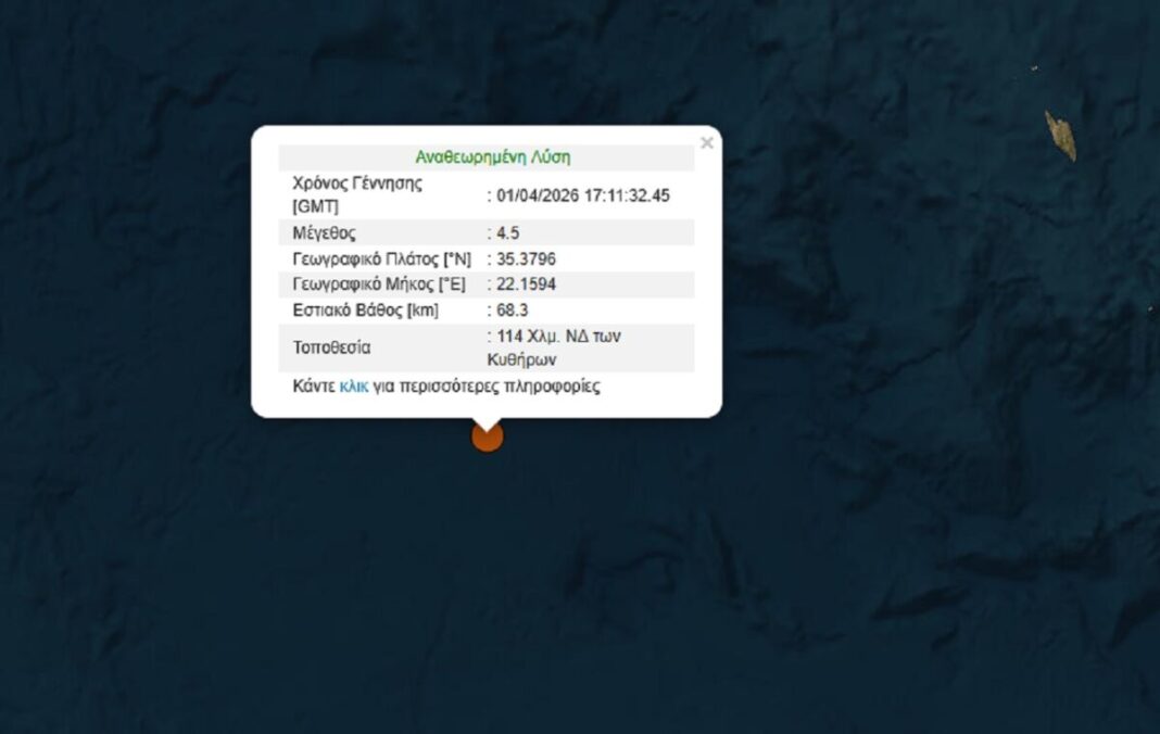 Σύμφωνα με το Γεωδυναμικό Ινστιτούτο ο σεισμός σημειώθηκε σε θαλάσσια περιοχή ανοικτά της Κρήτης και των Κυθήρων και είχε εστιακό βάθος 68,3 χλμ.