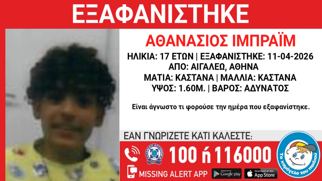 Κινητοποίηση της αστυνομίας στο Αιγάλεω για την εξαφάνιση του Αθανάσιου Ιμπραΐμ αιγυπτιακής καταγωγής. Ο ανήλικος εξαφανίστηκε από χώρο φιλοξενίας, όπως ανακοίνωσε, μεταξύ άλλων, το Χαμόγελο του Παιδιού την Τετάρτη (15.04.2026).