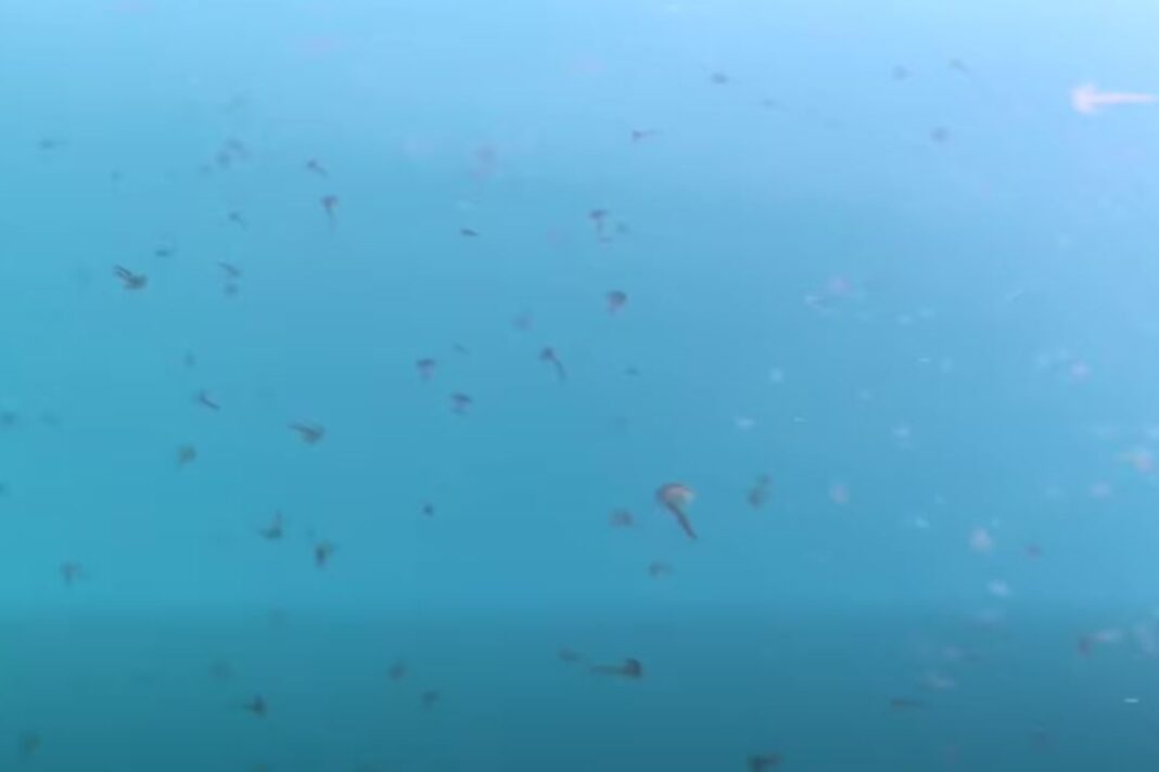 Σε βίντεο που κυκλοφόρησε στα social media, φαίνονται ξεκάθαρα εκατοντάδες μέδουσες να επιπλέουν στη θάλασσα, σε αποχρώσεις μωβ και καφέ. Μικρές και μεγάλες, έχουν κατακλύσει την περιοχή σε τέτοιο βαθμό που, σύμφωνα με μαρτυρίες, εκτείνονται για πάνω από 5 μίλια – από τα Πολιτικά μέχρι τη Δάφνη.