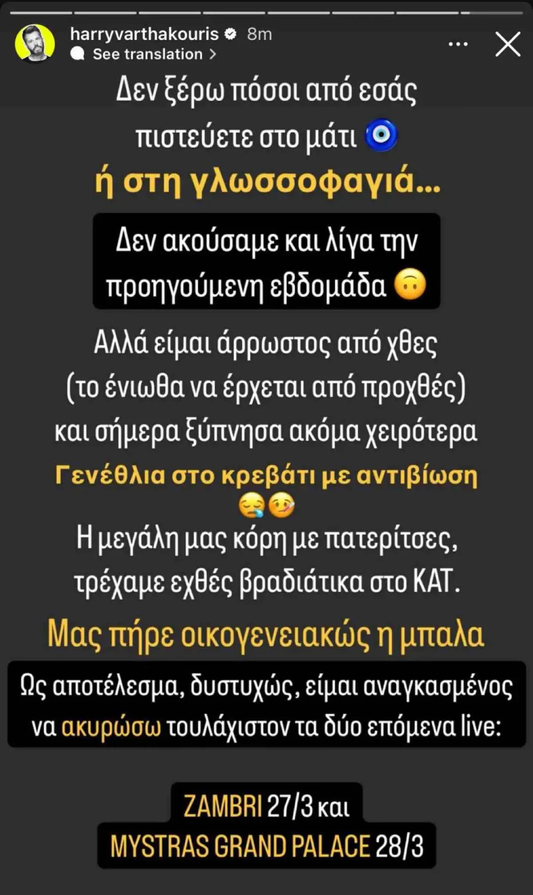 Με αφορμή όσα έχουν συμβεί τις τελευταίες ημέρες, ο τραγουδιστής προχώρησε σε μια μακροσκελή ανάρτηση στον προσωπικό του λογαριασμό στο Instagram, μέσω της οποίας αποκάλυψε ότι πιστεύει ότι έχουν ματιάσει τον ίδιο και την οικογένειά του, καθώς εκείνος είναι άρρωστος ενώ η μεγαλύτερη κόρη του έσπασε το πόδι της και χρειάστηκε να οδηγηθεί στο ΚΑΤ.