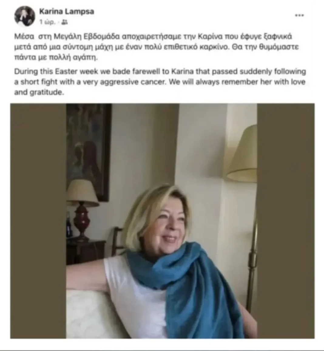 «Μέσα στη Μεγάλη Εβδομάδα αποχαιρετήσαμε την Καρίνα Λάμψα που έφυγε ξαφνικά μετά από σύντομη μάχη με έναν πολύ επιθετικό καρκίνο. Θα τη θυμόμαστε πάντα με πολλή αγάπη» γράφει η ανάρτηση με την οποία γνωστοποιήθηκε ο θάνατός της. Σύμφωνα με τις πρώτες πληροφορίες ο τύπος καρκίνου που αντιμετώπιζε ήταν επιθετικός, με αποτέλεσμα ο αγώνας της να είναι σύντομος.