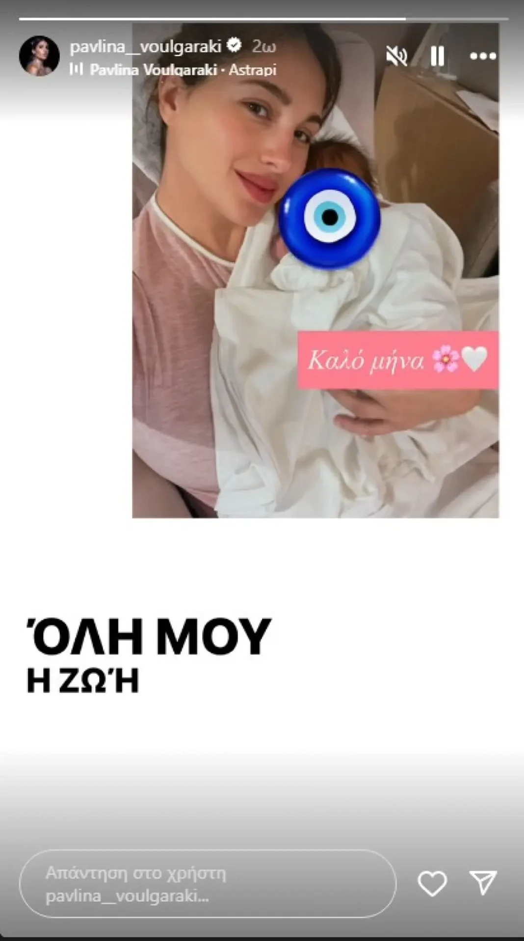 Η Παυλίνα Βουλγαράκη έκανε πριν από λίγη ώρα και την πρώτη ανάρτηση με την κόρη της, στην οποία ποζάρει μαζί της της και του αφιερώνει το τραγούδι της «Αστραπή», γράφοντας: «Στ’ όνομά σου απλώνεται όλη μου η ζωή», που μπορεί να συμπυκνώνει και τον καταιγισμό συναισθημάτων της νέας μαμάς.