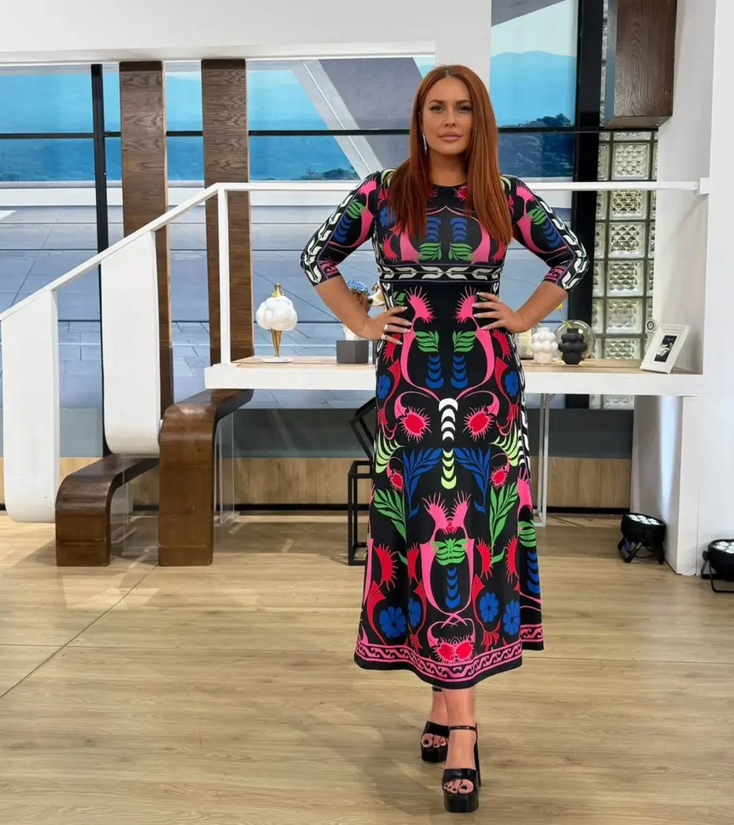 Το φόρεμα, με σχέδιο που επιμηκύνει το σώμα και floral prints, αποτελεί ιδανική επιλογή για κομψές all-day εμφανίσεις. Η Χρηστίδου συνδύασε το outfit με ψηλοτάκουνες πλατφόρμες, δημιουργώντας μια statement εικόνα που κολακεύει κάθε γυναίκα.