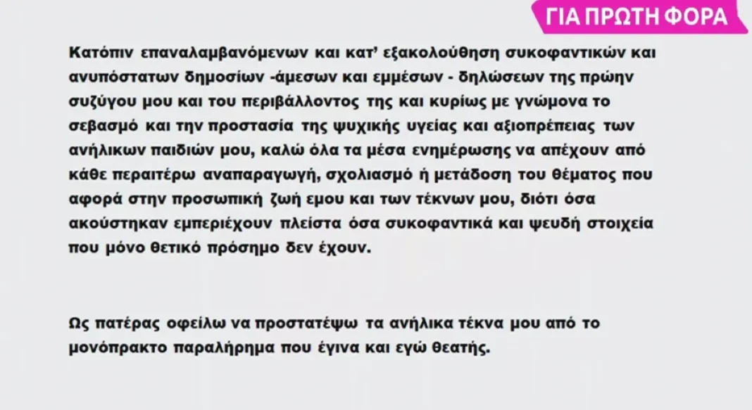 Επειδή η παρουσιάστρια έχει κλείσει συνέντευξη στην εκπομπή της ΕΡΤ, Μαμά-δες, η οποία θα προβληθεί την Κυριακή 8/9, φοβήθηκε η πλευρά του για όσα μπορεί να έχουν ειπωθεί για εκείνον και το διαζύγιό του και θέλησε να προλάβει καταστάσεις – δείτε εδώ αναλυτικα.