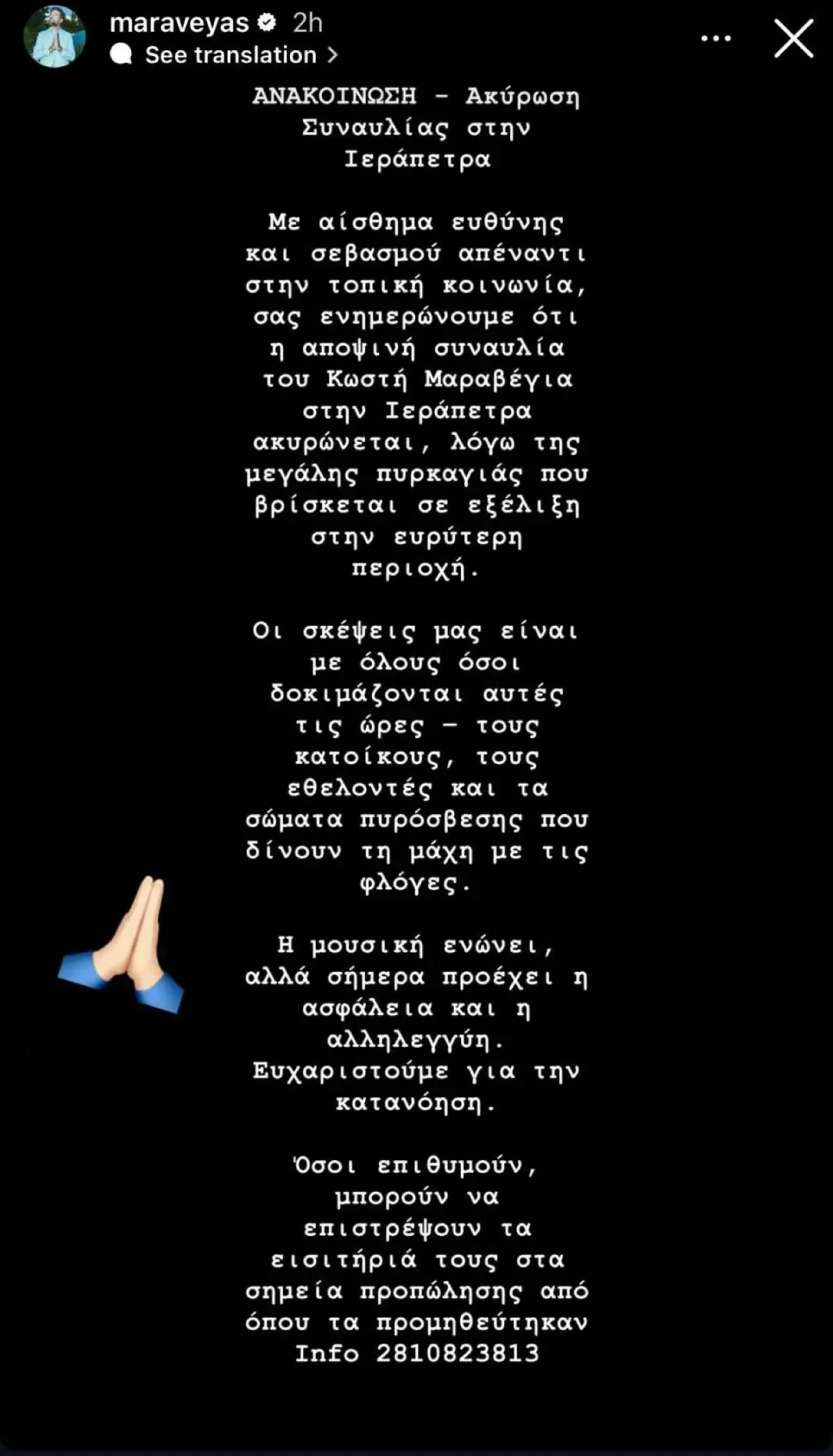 Με αίσθημα ευθύνης και σεβασμού απέναντι στην τοπική κοινωνία, σας ενημερώνουμε ότι η αποψινή συναυλία του Κωστή Μαραβέγια στην Ιεράπετρα ακυρώνεται, λόγω της μεγάλης πυρκαγιάς που βρίσκεται σε εξέλιξη στην ευρύτερη περιοχή. Οι σκέψεις μας είναι με όλους όσοι δοκιμάζονται αυτές τις ώρες – τους κατοίκους, τους εθελοντές και τα σώματα πυρόσβεσης που δίνουν τη μάχη με τις φλόγες.