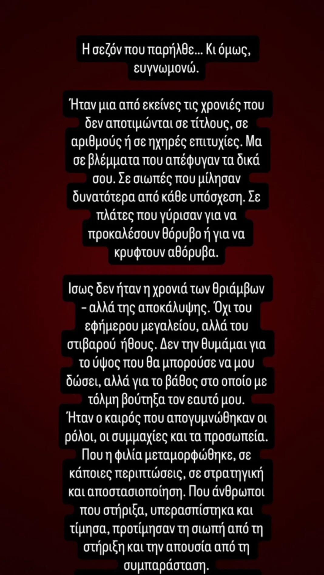 Η ανάρτησή του μοιάζει με έναν απολογισμό μιας ταραγμένης σεζόν, κατά την οποία, όπως φαίνεται, είδε «πλάτες να γυρίζουν για να προκαλέσουν θόρυβο» και «φίλους να μεταμορφώνονται σε στρατηγική και αποστασιοποίηση». Όλα αυτά λίγο καιρό μετά το επαγγελματικό διαζύγιό του με την Κατερίνα Καινούργιου, που όπως λέγεται δεν έμεινε μόνο σε τηλεοπτικό επίπεδο, αλλά επηρέασε και τη φιλία τους.