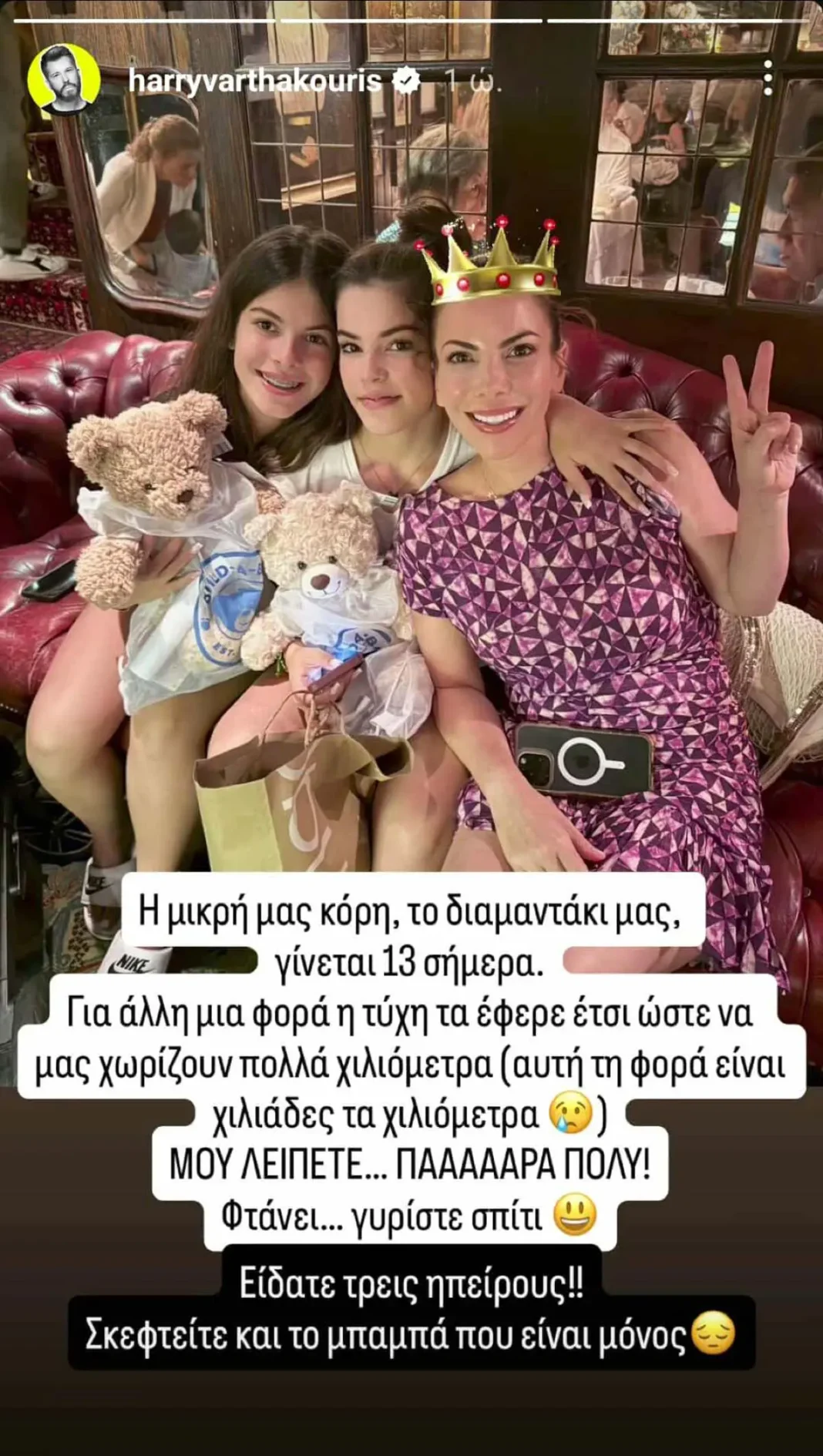 «Η μικρή μας κόρη, το διαμαντάκι μας, γίνεται 13 σήμερα. Για άλλη μια φορά η τύχη τα έφερε έτσι ώστε να μας χωρίζουν πολλά χιλιόμετρα (αυτή τη φορά είναι χιλιάδες τα χιλιόμετρα). ΜΟΥ ΛΕΙΠΕΤΕ… ΠΑΑΑΑΑΡΑ ΠΟΛΥ! Φτάνει… γυρίστε σπίτι. Είδατε τρεις ηπείρους!! Σκεφτείτε και το μπαμπά που είναι μόνος», έγραψε με μία δόση χιούμορ ο Χάρης Βαρθακούρης.