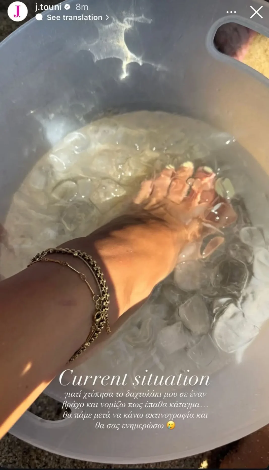 «Current situation, γιατί χτύπησα το δαχτυλάκι μου σε έναν βράχο και νομίζω πως έπαθα κάταγμα… θα πάμε μετά να κάνω ακτινογραφία και θα σας ενημερώσω 🥲», έγραψε η Ιωάννα Τούνη στην ανάρτηση που έκανε στον προσωπικό της λογαριασμό στο Instagram.