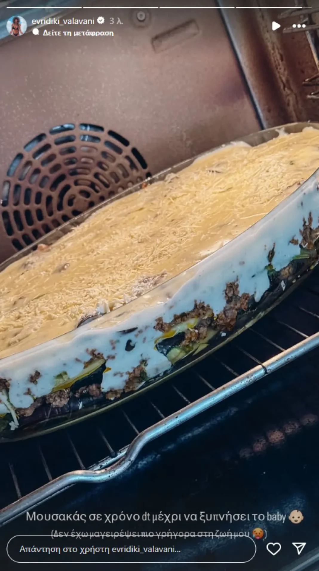 Όπως αποκάλυψε σήμερα, Τετάρτη 23 Ιουλίου, στον προσωπικό της λογαριασμό στο Instagram, κατάφερε να ξεκλέψει λίγο χρόνο προκειμένου να μπει στην κουζίνα και να μαγειρέψει για εκείνη και τον σύζυγό της την στιγμή που ο μικρός κοιμόταν. Συγκεκριμένα, στην φωτογραφία που μοιράστηκε με το ταψί από τον φούρνο, αποκάλυψε ότι μαγείρεψε πολύ γρήγορα μουσακά. ενώ, έγραψε χαρακτηριστικά: «Μουσακάς σε χρόνο dt μέχρι να ξυπνήσει το μωρό (δεν έχω μαγειρέψει πιο γρήγορα στη ζωή μου)».