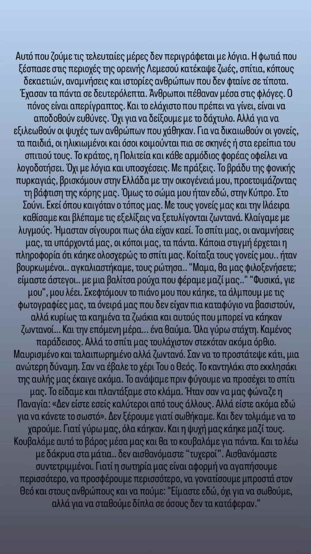 «Σας εύχομαι, ειλικρινά, να μη χρειαστεί ποτέ να ζήσετε αυτό που ζήσαμε εμείς, για να καταλάβετε τι σημαίνει να βλέπεις τη φωτιά να πλησιάζει το σπίτι σου και να νομίζεις πως όλα τελείωσαν και πως δεν έχεις ούτε τα βασικά να προσφέρεις στο παιδάκι σου και στη γυναίκα σου. Ανυπομονούμε να επιστρέψουμε, να σηκώσουμε μανίκια και να βοηθήσουμε όσους μας έχουν πραγματικά ανάγκη. Ελπίζω το ίδιο να πράξουν και οι αρμόδιοι», αναφέρει μεταξύ άλλων ο Μαυρίκιος Μαυρικίου στο κλείσιμό του.