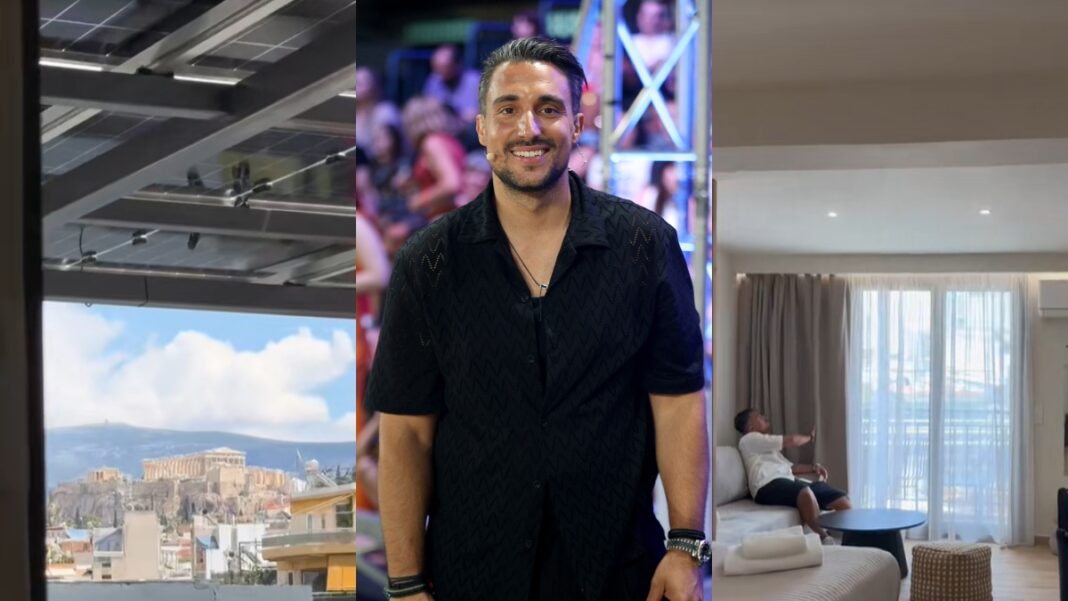 Μέσα από την ανάρτησή του αποκάλυψε ποια είναι η διεύθυνσή του και έδειξε κάποιους από τους χώρους του. Διαθέτει roof garden με θέα την Ακρόπολη, όπως και πολλά από τα δωμάτια, μεγάλα δωμάτια, με κάποια από αυτά να έχουν και τζακούζι, όλα σε γήινα χρώματα, που δημιουργούν ηρεμία και την αίσθηση της χαλάρωσης.