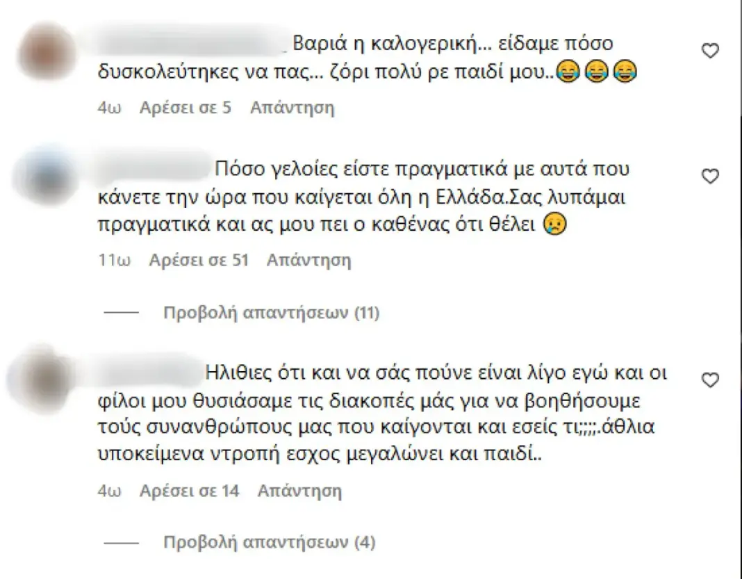 «Ηλ..ιες ό,τι και να σας πού πούνε είναι λίγο. Εγώ και οι φίλοι μου θυσιάσαμε τις διακοπές μας για να βοηθήσουμε τους συνανθρώπους μας που καίγονται και εσείς τι; Άθλια υποκείμενα, ντροπή, αίσχος. Μεγαλώνει και παιδί», έγραψε χρήστης, ενώ άλλος σχολίασε: «Πόσο γελοίες είστε πραγματικά με αυτά που κάνετε την ώρα που καίγεται όλη η Ελλάδα. Σας λυπάμαι πραγματικά και ας μου πει ο καθένας ό,τι θέλει».