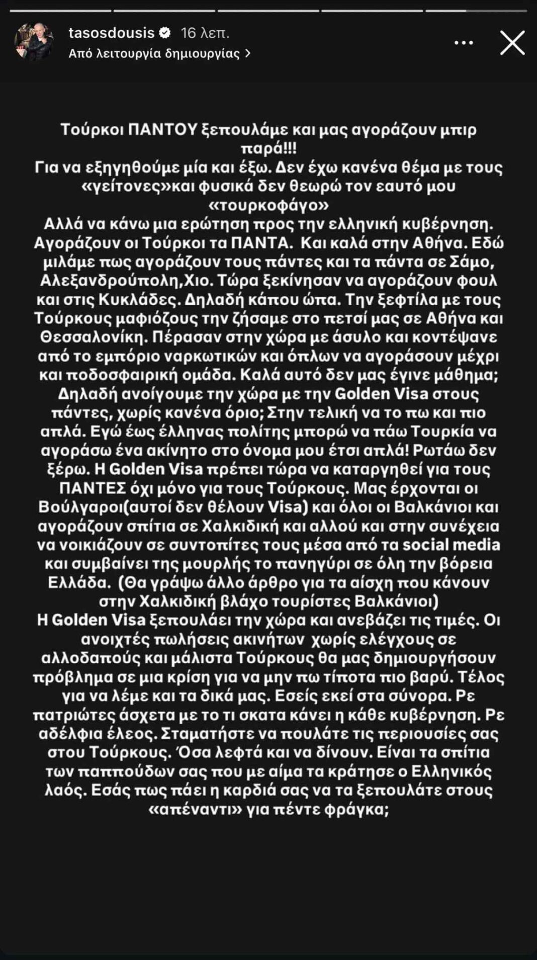 Ο Τάσος Δούσης, μέσα από μια μακροσκελή ανάρτηση που έκανε στον προσωπικό του λογαριασμό στο Instagram, ξέσπασε για την αγορά ακινήτων από Τούρκους και όχι μόνο στην Ελλάδα. Ο γνωστός δημοσιογράφος και εκδότης εξέφρασε την έντονη ανησυχία του για το ζήτημα, κάνοντας λόγο για ξεπούλημα περιουσιών και καλώντας την κυβέρνηση να λάβει μέτρα σχετικά με την πολιτική της Golden Visa.