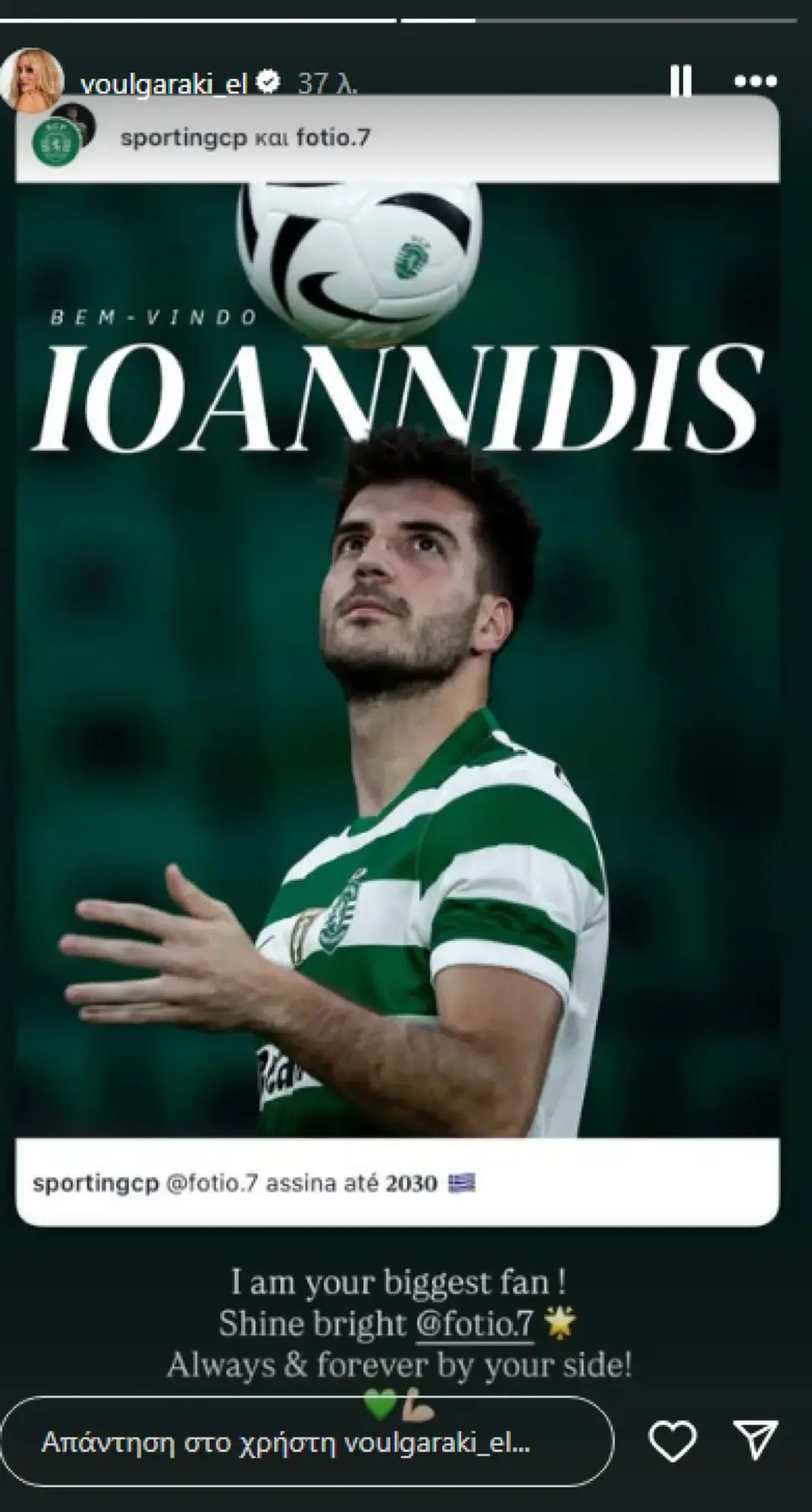 «Είμαι η μεγαλύτερη θαυμάστρια σου. Λάμψε δυνατά Φώτη! Για πάντα στο πλευρό σου», έγραψε η Ελένη Βουλγαράκη, αναδημοσιεύοντας την ανακοίνωση της ομάδας. Η απόσταση δεν φαίνεται να μειώνει τον έρωτά τους.