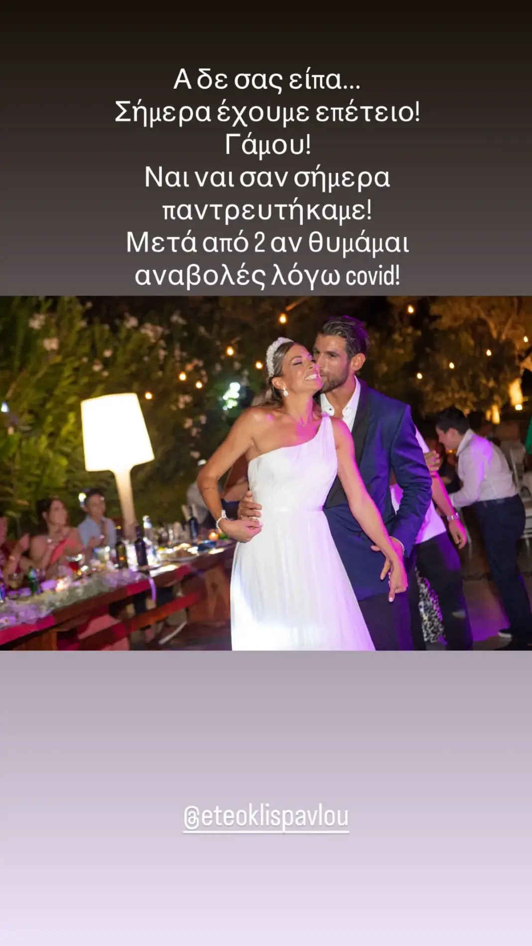 «Α, δεν σας είπα… Σήμερα έχουμε επέτειο! Γάμου! Ναι, ναι, σαν σήμερα παντρευτήκαμε! Μετά από 2 αν θυμάμαι αναβολές λόγω covid!», έγραψε αρχικά.
