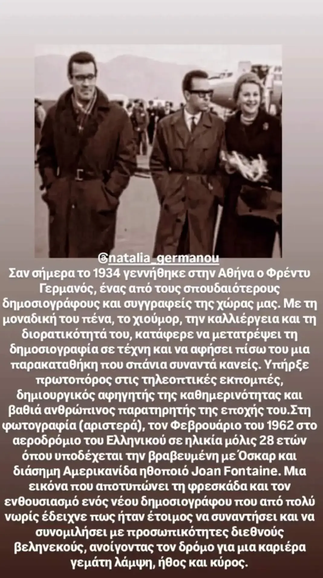 «Υπήρξε πρωτοπόρος στις τηλεοπτικές εκπομπές, δημιουργικός αφηγητής της καθημερινότητας και βαθύς ανθρώπινος παρατηρητής της εποχής του. Στη φωτογραφία (αριστερά), τον Φεβρουάριο του 1962 στο αεροδρόμιο του Ελληνικού σε ηλικία μόλις 28 ετών όπου υποδέχεται την βραβευμένη με Όσκαρ και διάσημη Αμερικανίδα ηθοποιό Joan Fontaine. Μια εικόνα που αποτυπώνει τη φρεσκάδα και τον ενθουσιασμό ενός νέου δημοσιογράφου που από πολύ νωρίς έδειχνε πως ήταν έτοιμος να συναντήσει και να συνομιλήσει με προσωπικότητες διεθνούς βεληνεκούς, ανοίγοντας τον δρόμο για μια καριέρα γεμάτη λάμψη, ήθος και κύρος», κλείνει το κείμενό του για τον Φρέντυ Γερμανό ο Άρης Λουπάσης