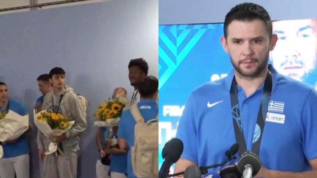 Όλοι τους φορούσαν τα χάλκινα μετάλλια στο στήθος τους και παρέλαβαν τιμητικές πλακέτες για την επιτυχία τους, ενώ κατά την άφιξή τους έπαιζε από πίσω το τραγούδι “Final Countdown”. Λίγο αργότερα, ο Βασίλης Σπανούλης και ο αρχηγός της ομάδας, Κώστας Παπανικολάου (δείτε εδώ ποια είναι η γυναίκα του) έκαναν δηλώσεις για όσα έζησαν.