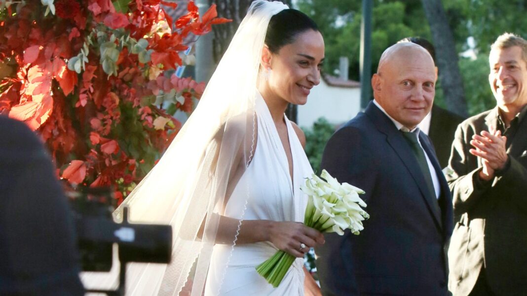 Η νύφη φόρεσε ένα ονειρεμένο νυφικό του Χρήστου Κωσταρέλου, που θύμιζε το σχέδιο της Χρυσής Βαρδινογιάννη, συνδυάζοντας διαχρονική κομψότητα με μοντέρνες πινελιές.