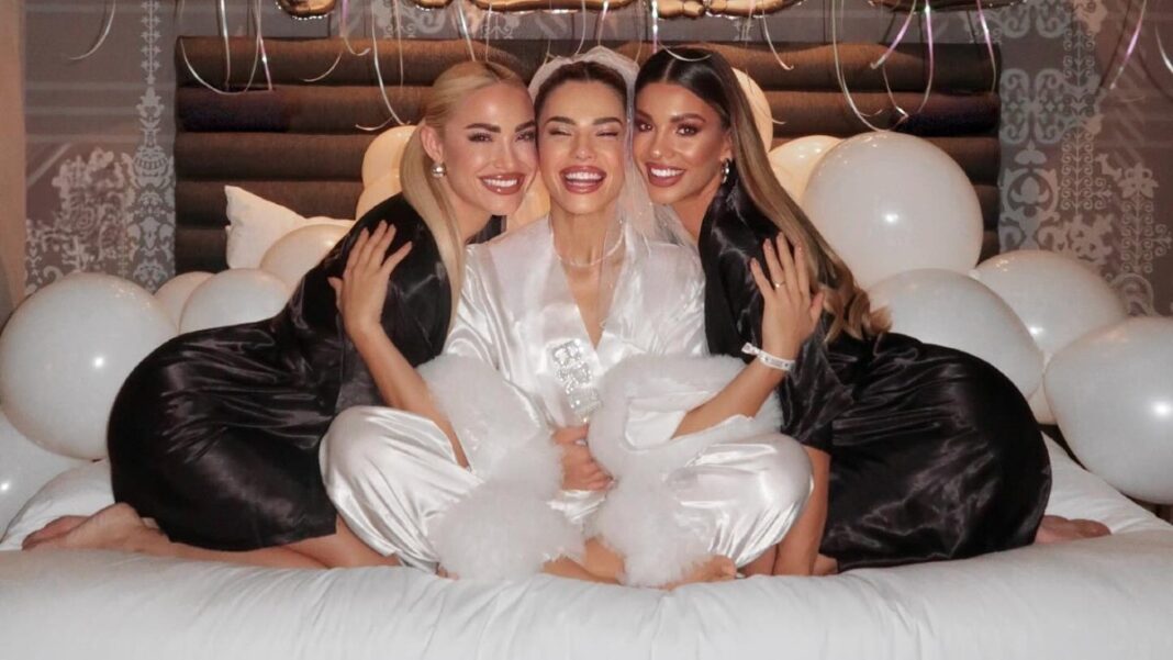 Σε μία από τις πιο τρυφερές φωτογραφίες που δημοσίευσε στο Instagram, η Ιωάννα Τούνη ποζάρει αγκαλιά με τη Στέλλα και την Έφη, όλες με σατέν πιτζάμες σε ένα εντυπωσιακά διακοσμημένο δωμάτιο, γεμάτο άσπρα μπαλόνια και τεράστια γράμματα «BRIDE» στο φόντο ένα σκηνικό που θα ζήλευαν πολλές νύφες.