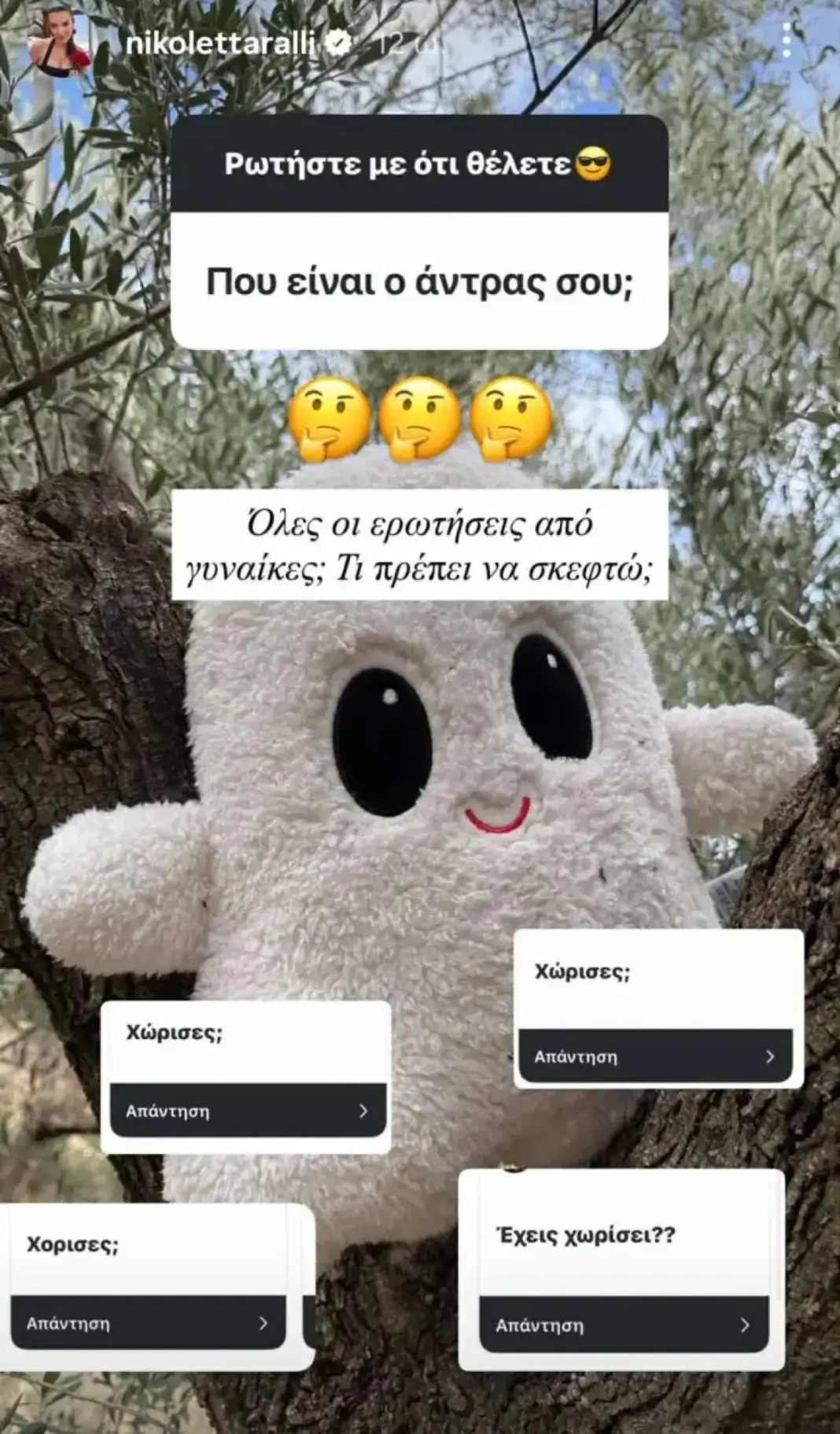 «Όλες οι ερωτήσεις από γυναίκες; Τι πρέπει να σκεφτώ;», έγραψε η Νικολέττα Ράλλη, η οποία θέλει όσο μπορεί να κρατάει την προσωπική της ζωή μακριά από τα φώτα της δημοσιότητας.