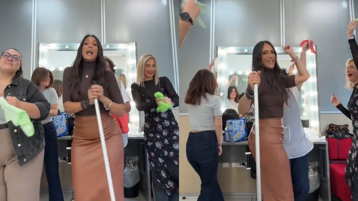 Βρισκόταν στο καμαρίνι της στα γραφεία του MEGA και χόρευε με τους συνεργάτες της το τραγούδι της Ελένης Φουρέιρα «Δεν κάνω εγώ για σπίτι», από τον ολοκαίνουριο δίσκο της, κρατώντας σκούπα και πετσετάκι στα χέρια της.