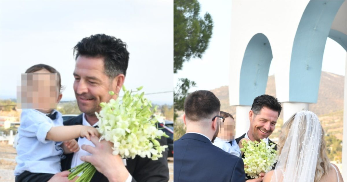 Ο Απόστολος Ρουβάς έφτασε στην εκκλησία, έχοντας στην αγκαλιά του το αγοράκι τους, που σε λίγη ώρα πρόκειται να πάρει το όνομα Αλκίνοος.