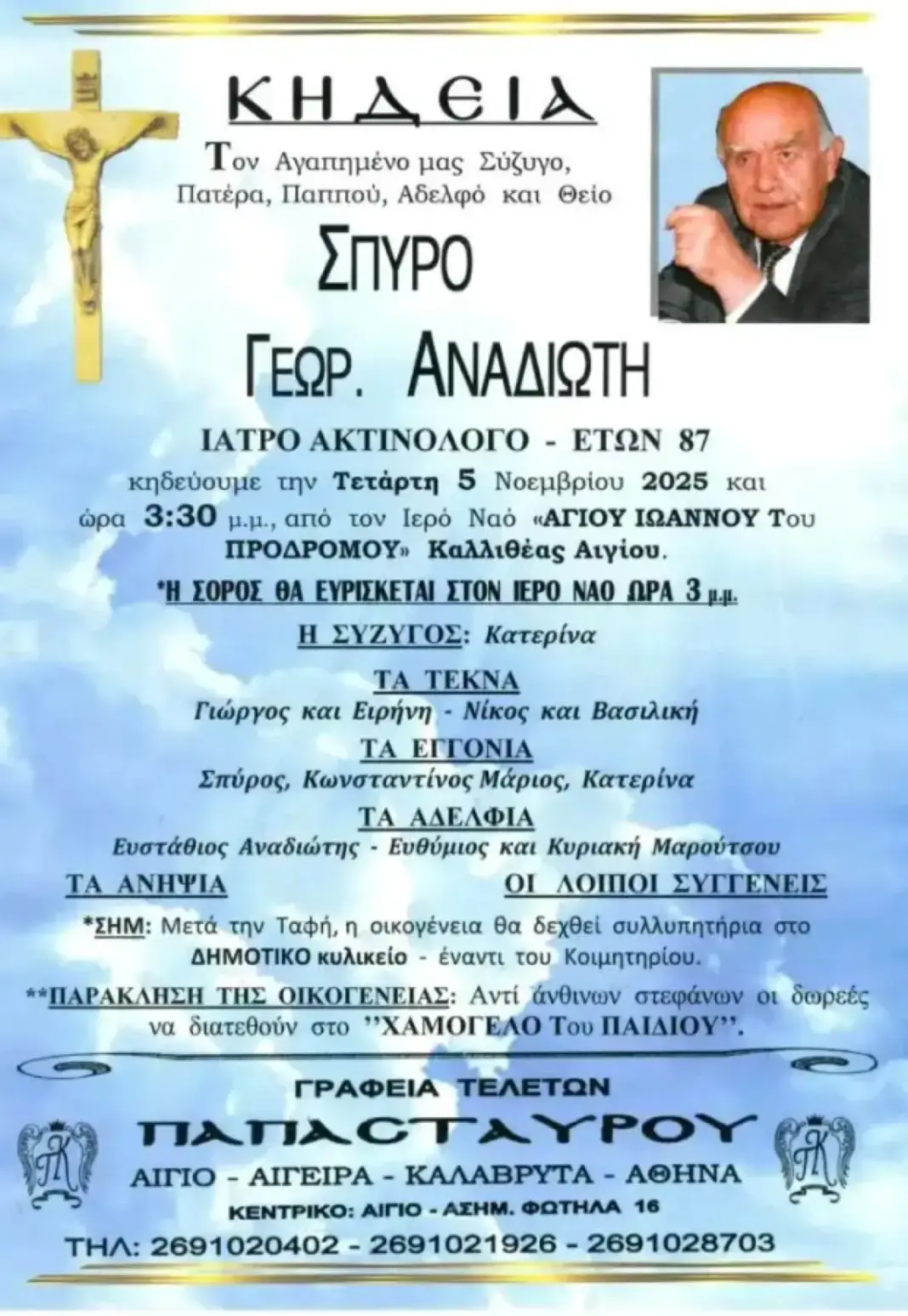 Ο Ευρωβουλευτής Νίκος Αναδιώτης βιώνει δύσκολες στιγμές, καθώς ο πατέρας του, Σπύρος, έφυγε από τη ζωή πριν από λίγες ημέρες. Η κηδεία του θα πραγματοποιηθεί σήμερα, Τετάρτη 5 Νοεμβρίου, στις 3:00 το μεσημέρι στον Ιερό Ναό του Αγίου Νικολάου του Προδρόμου στην Καλλιθέα Αιγίου. Η οικογένεια του Νίκου Αναδιώτη θρηνεί την απώλεια του αγαπημένου τους προσώπου.