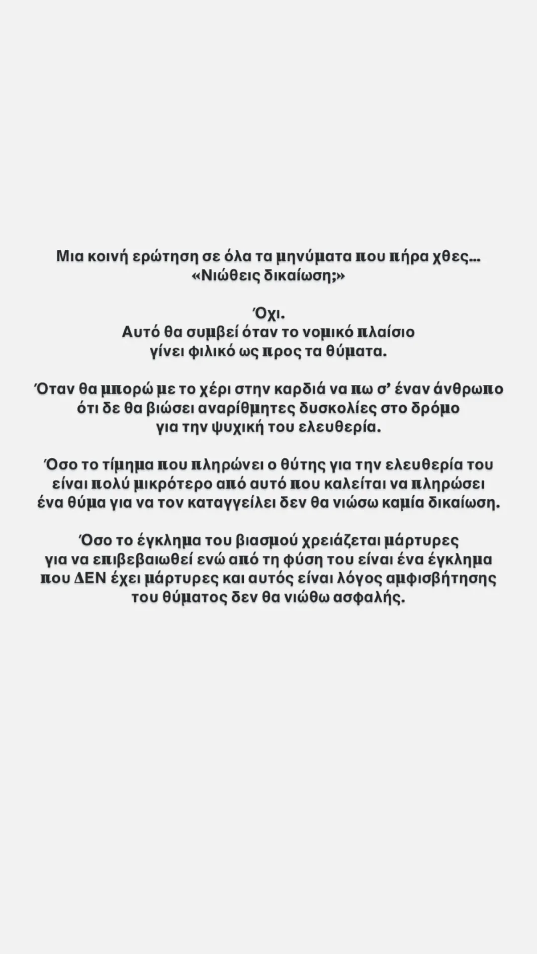 «Με ρωτούν γιατί κάνω παράσταση τη Μέδουσα… Γιατί δε μιλάει κανείς γι’ αυτό. Σε επανάληψη μεσημεριάτικα τα καλύτερα, λέει, σίριαλ της ελληνικής τηλεόρασης με πρωταγωνιστή σε ολα καταδικασμένο άνθρωπο για απόπειρες βιασμού. Ντρέπομαι για την ελληνική κοινωνία. Και δεν λυπάμαι πια, επιτέλους θυμώνω», έγραψε η ηθοποιός σε story που ανέβασε, δείχνοντας σαφώς την αγανάκτησή της.