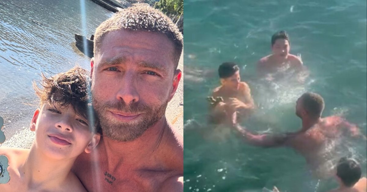 Στο βίντεο που ανήρτησε στο Instagram ο Γιώργος Μανίκας, ο ίδιος είναι πίσω από δύο παιδιά: αριστερά είναι ο γιος του (με το κόκκινο μαγιό) και δεξιά ένα άλλο παιδί (με ένα μπλε μαγιό).