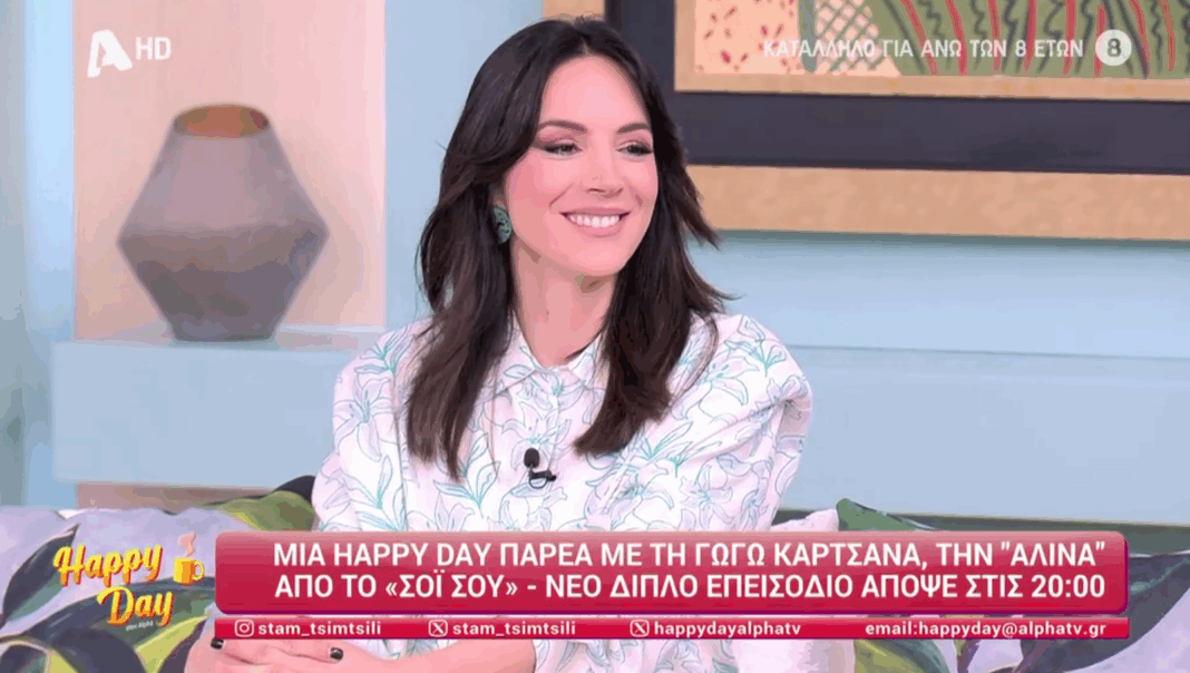 Η Γωγώ Καρτσάνα, η Αλίνα της σειράς, Το Σόι σου, βρέθηκε καλεσμένη σήμερα στην εκπομπή «Happy Day» και μίλησε για τη σειρά που αγαπούν μικροί και μεγάλοι.